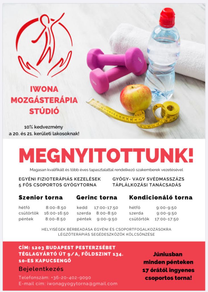 Az ajándékutalvanyt az iwonagyogytorna@gmail.com címen lehet megigényelni. Fizetés és a pecséttel ellátott utalvány átvétele személyesen történik az Iwona Mozgásterápia Stúdióban ,1203 Budapest Téglagyártó út 9/a.